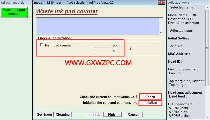 點(diǎn)擊Check按鈕,獲取當(dāng)前廢墨計(jì)數(shù)器的數(shù)值,然后選中計(jì)數(shù)器前面的選擇框,點(diǎn)擊Initialization按鈕完成初始化。