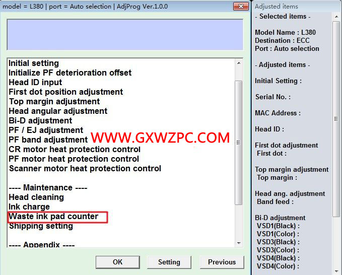 3. 選擇Waste ink pad counter(廢墨計(jì)數(shù)器)