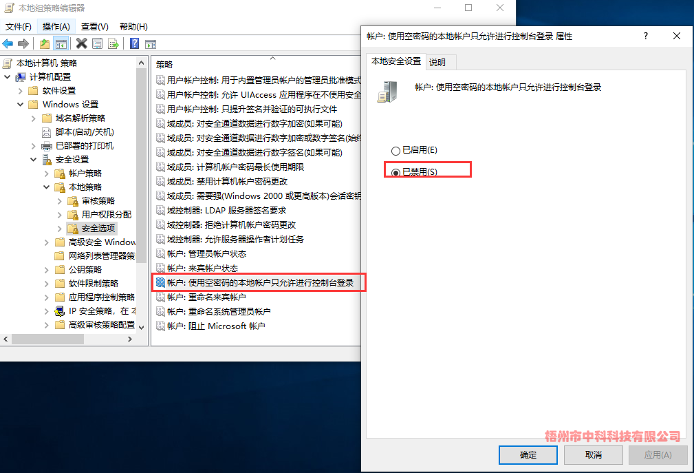 (2)、計算機配置->Windows設(shè)置->安全設(shè)置->本地策略->安全選項->帳戶:使用空密碼的本地帳戶只允許進(jìn)行控制臺登錄->已禁用